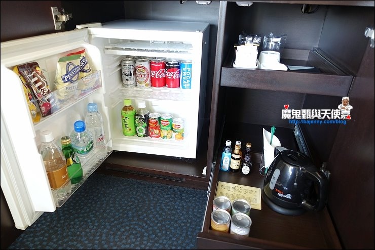 電視櫃下方是minibar、冰箱、快煮壺及杯子等相關備品都在這。飯店每天提供二瓶免費礦泉水,冰箱裡的飲料及零食都需要另外付費。