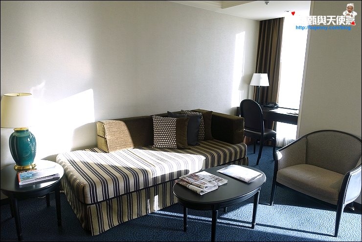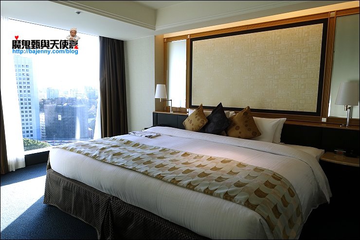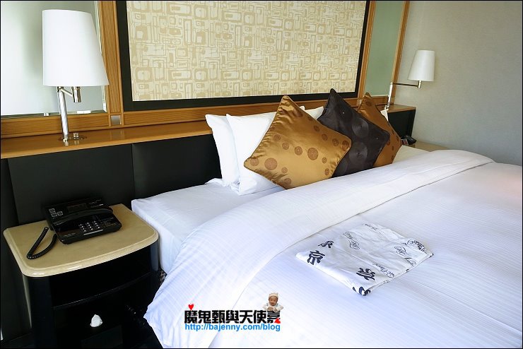 飯店房內的燈控可以在床頭電話旁總控制,床上也有附一件薄的浴衣,怕熱的朋友可以穿這個比較涼爽。床又大又舒服,床中間不會有併床的凹陷,四大顆枕頭外加三顆抱枕,人多也不用搶!