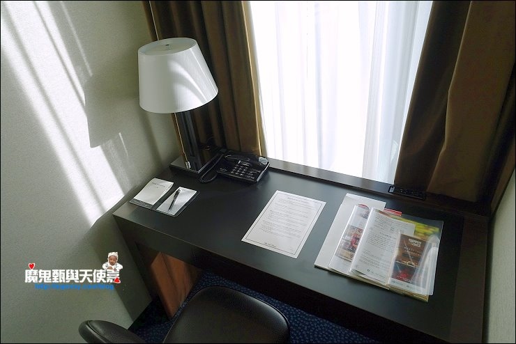 面像我出國一樣得開電腦上工的人來說,書桌舒適度大大影響了我的心情,東京新大谷的書桌是面對窗戶採光好又有景觀,可以帶著好心情工作。書桌這邊有二孔插座,我的電腦、手機跟相機都是在這邊充電。