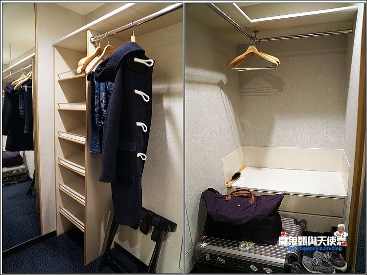 一進門左邊是超大更衣間,備有室內拖鞋及保險箱,行李二咖全部攤開都沒問題。