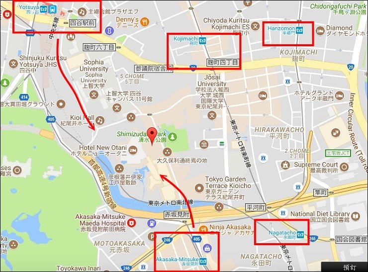 新大谷是由三棟大建築連在一起構成,有office building會議棟、新館花園塔樓(Garden Tower)、主樓(The Main)。東京新大谷飯店的交通非常便利,除了機場利木津巴士直達,東京地鐵好幾條線都有到,赤阪見附站、麴町站、永田町站及四ツ谷站。最近的地鐵站是赤阪見附站,走過來約三分鐘就到花園塔樓,非常近,從四ツ谷站走到飯店需要約十分鐘,拖行李需要走一小段,直接到The Main主樓。