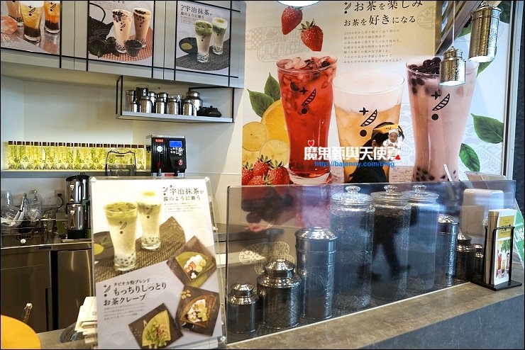 先在一樓的茶BAR買杯茶潤潤口,茶BAR是以宇治抺茶為主的抺茶專賣店,店家也有提供岩鹽口味,可以鬥出茶的甜味,蜜烏龍茶與珍珠奶茶也是熱點菜單,但我台灣來的,烏龍茶跟珍奶留在台灣喝就好,來到京都當然是要喝抺茶呀!我看到店員挖了一大球的抺茶進去(像在挖冰淇淋的感覺),直接加入茶飲裡,搖一搖就可以喝啦,口味我非常喜歡,偶爾會喝到抺茶泥,口感極好,對了,點餐時要記得看是要少冰或三分糖,珍珠本身已經有甜度了,若像我一樣不喝太甜的朋友,飲料甜度可以三分糖即可。