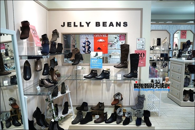 女鞋也是我在日本很愛買的項目之一,像我這種腳的人的,很適合來日本買鞋,日本鞋子的尺吋都有做到21小碼,我穿到適合的鞋子,往往一買就是二三雙一起帶!JELLY BEANS的鞋墊特別設計,底有緩衝穿起來更舒服,要知道,一穿好鞋才能讓我們走遍天下,絕對不能省。對了,JELLY BEANS出示護照不止滿五千日圓可免稅省8%,還額外再有5%優惠,不買對不起自己啊..
