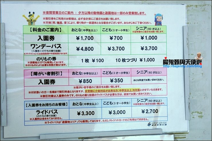票券在入口處購買,動物園入園票大人1,700日幣/3歲到國小生700日幣,園區內除了動物園之外,還有像摩天輪、咖啡杯、雲宵飛車等樂園設施,遊樂設施採付費制,想玩的項目可以單次付費,若是想暢玩整天,可以購買入園券加樂園券票券,可以不限次數一天玩瘋!像我這種心臟不是太強,又要帶小孩的媽媽,園入園券即可,有想玩的遊樂設施再單次付費即可,但若是像允嘉哥這種體力過人又喜歡刺激的朋友,就建議買套票,不限次數一日玩到底。