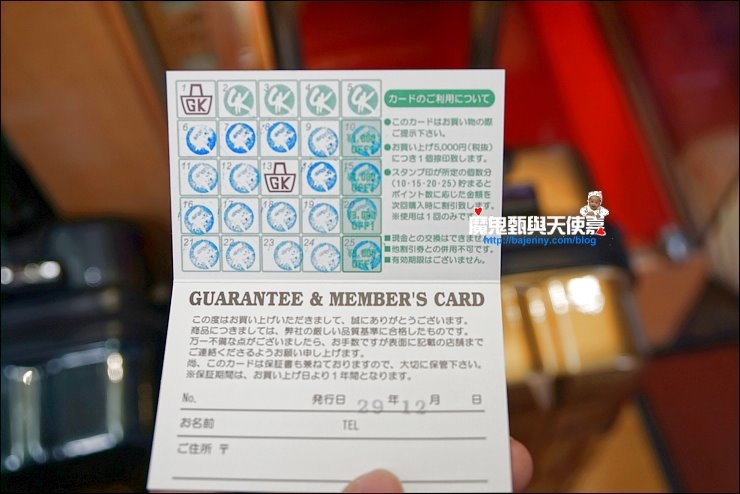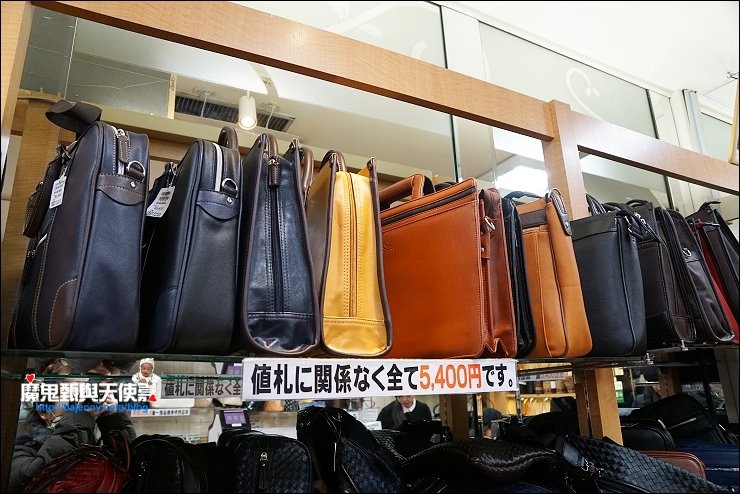 店內所有包款,如皮包、公事包、旅行箱、錢包和皮帶等,均一價5,400日圓(含稅)的超殺優惠價格,購買後店家會給一張集點卡,每一千日圓蓋一格,買一個包就集五格,滿25格就送一個任君挑選!!等於是買五送一的概念,看來揪團一起買更優惠!