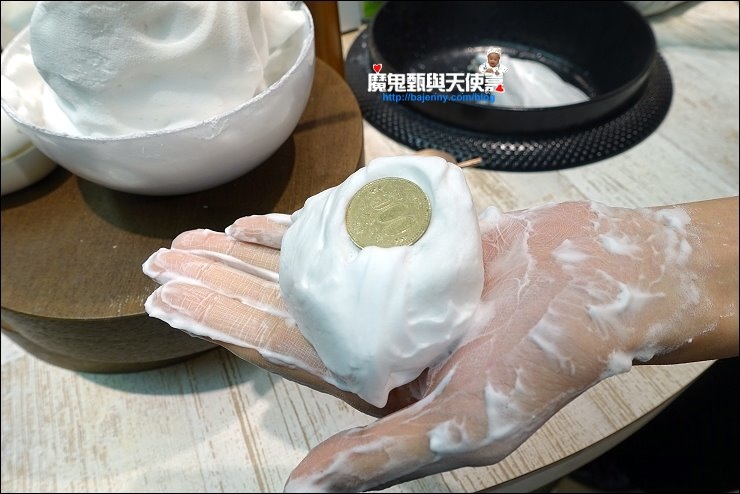 這間店有個小帥哥在搓泡泡吸引了我們的目光,這間店家"然Shikari,標榜無化學添加的保養品,洗臉皂只要一點點就可以搓出相當有彈性的泡,連五百圓硬添幣都壓不倒,用綿密柔軟有彈性的泡泡洗臉,想必很舒服,可以清潔臉部,讓皮膚更乾淨明亮。