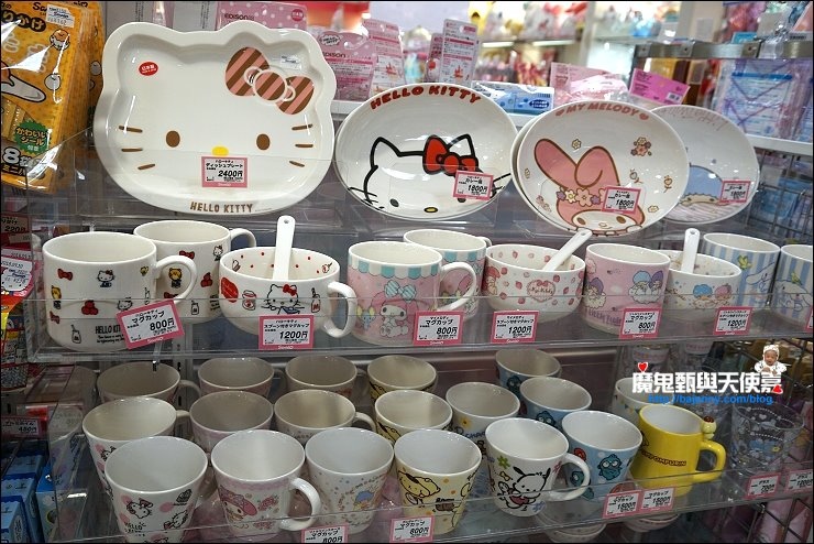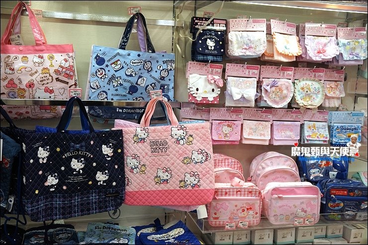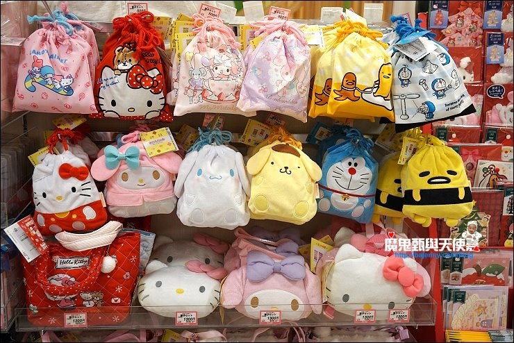 各種經典人物hello Kitty, Melody, 蛋黃哥,多拉ㄟ夢等等,束口袋收納小物很方便,可愛的碗盤杯子,吃飯喝水好心情,整間店都好好買。