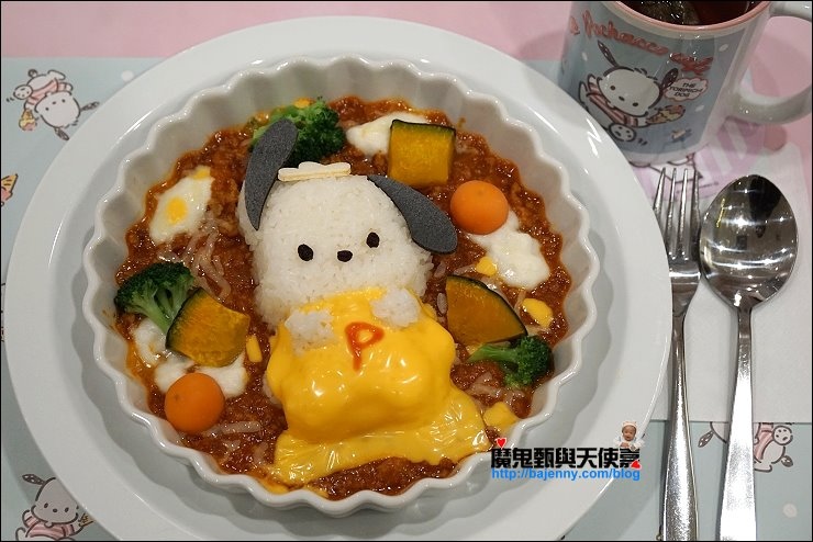 茄汁肉醬飯,起司片作為POCHACCO(帕恰狗)的衣服,花椰菜、南瓜、紅蘿蔔,色彩豐富看起來好美味,我們餓翻啦,拍完照直接啃食!