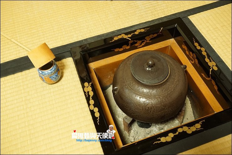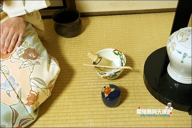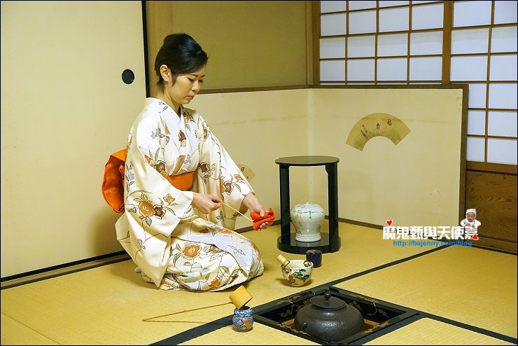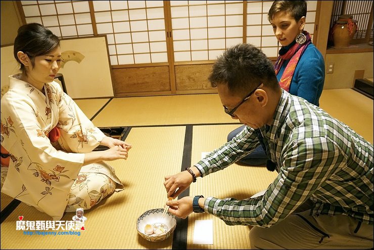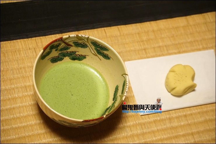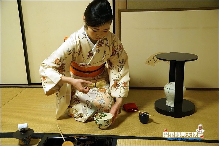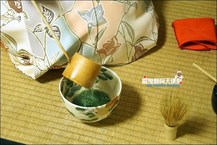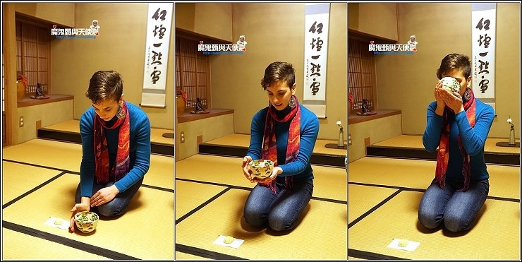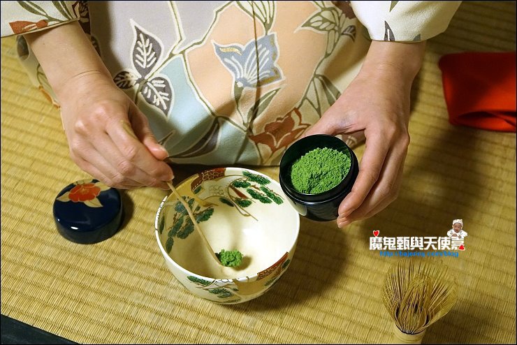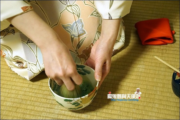 加入幾匙抺茶粉,倒入熱水,開始用木製茶筅打茶,打的方式與速度決定產生的泡泡與抺茶好喝與否,端坐在榻榻米上看著茶師優雅地進行打茶的每個步驟,慢慢地我的心變的好平靜,好像可以感受茶道中的和敬清寂。