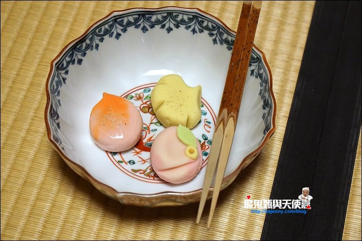 抹茶必備的和菓子,一般和菓子都小小一個,而みどり園的和菓子都是自製的,會依季節設計出應景的和菓子,12月是黃澄澄的銀杏與楓紅季節,黃色的和菓子就像黃色的銀杏葉,每顆和菓子的份量不小!我在日本有過好多次抹茶體驗,みどり園是第一間端出整碗的和菓子,讓食用客人自己夾,並跟我們分享筷子要雙手去捧起來,再夾和菓子,放回筷子也是有一定的規距,不是像在家吃飯那樣隨便。