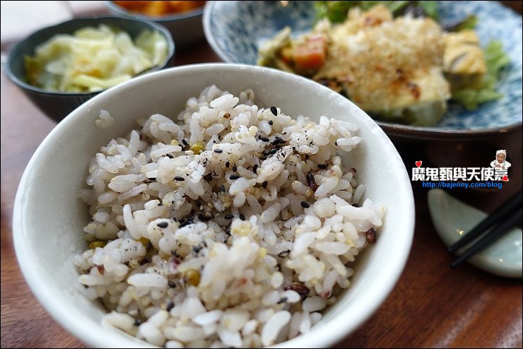 中午定時菜單選擇不多,大概只有四五樣定食可選,有素食菜單,另外還有甜點或下午茶套餐,我們點了當天限定套餐,非常新鮮的生菜與焗烤魚肉,有三道配菜及味噌湯,配菜有超清甜的滷白菜,蒸南瓜與高麗菜,小菜視當季食材菜色不一定,菜式算是很用心,米飯可以選玄米或是八榖米,八穀米營養多多,這套吃下來雖不是大魚大肉,卻吃到食材的原味,好吃健康沒負擔!