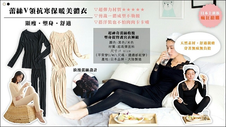 上團賣的這套保暖衣不是我說,穿過的人都說讚!一套上去整個人就暖呼呼,媽媽說這件蕾絲好細有柔,質感很好,罩外衣微微小露香肩更是性感,經過實驗從45kg~70kg都可以穿,等於是S到XL都沒問題,娘家媽媽只有46kg穿起來也是貼身的,真的是大屁股小屁股都安啦~~