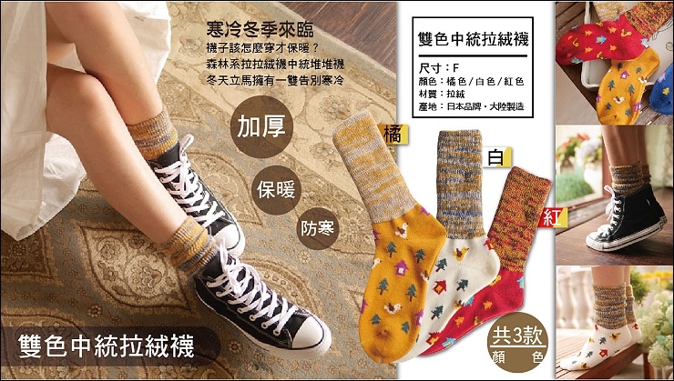 這款中統襪是我家妹妹的NO.1,她最愛白色底那色!原本廠商選較不容易出錯的黑跟藍,我硬是拉回紅跟橘兩個亮色,要知道冬天大家常常穿深色系外套,已經整個人很暗色了,至少襪子要有亮點,帶出一點精神啊~~