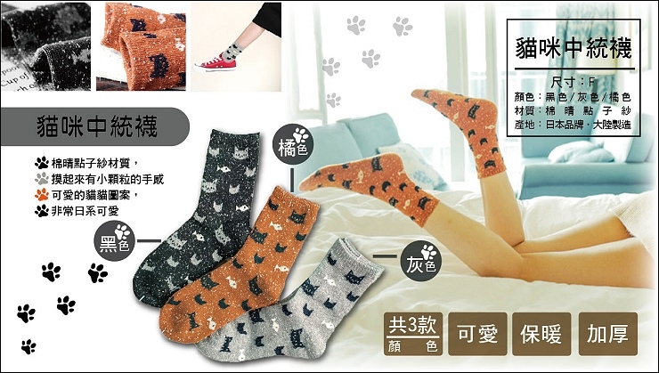 這雙貓咪襪是姐妹的第二名!圖案有大貓臉小貓臉跟魚兒, 穿起來頓時變得年輕又可愛!這雙觸感很特別,摸起來帶點小顆粒手感喔,大推橘跟灰,但我認為包色是必須的XD