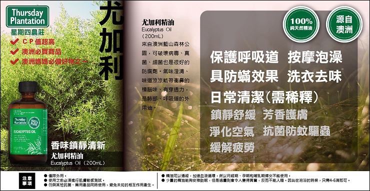 市面上精油的價差很大,我個人覺得澳洲的星期四農莊精油算是不錯的入門款,原本這次可以團三種精油(尤加利/茶樹/薰衣草),但茶樹跟薰衣草大缺貨,這次根本來不及(泣),只有以往反應最好的尤加利早早就訂貨有保留到!聽說這家的精油外面代購很多,合作廠商是正式報關進口,不但不用擔心買到假貨,價格還很漂亮!