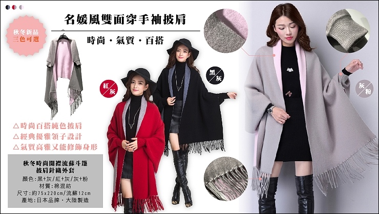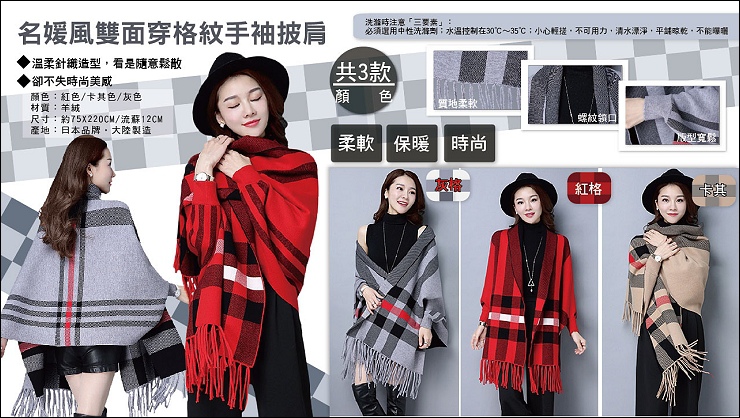 這款披肩最特別是手可以套進去,這樣就不用怕一直掉必須一直拉啦,我個人覺得小資女必備!待在有冷氣的辦公室,後頸跟手背長時間吹到風時會不舒服,這時機動性強好穿脫的手袖披肩有如神助!除了萬年百搭的黑/灰及灰/粉兩色,還幫大家選了應景過年的紅/灰色!希望大家在新的一年都能旺旺來~~
