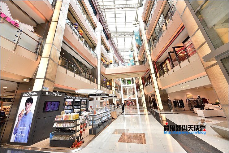 一樓中庭以天井設計,讓購物商場光線非常充足明亮,中庭有流水設計,結合陽光、空氣、水三大元素,就像是個會呼吸的購物中心,逛起來非常舒服自在。