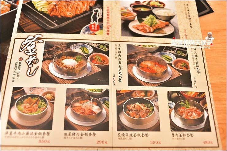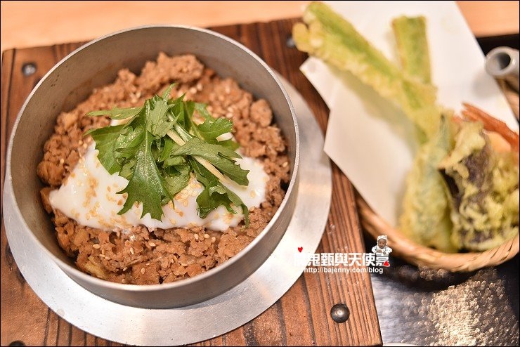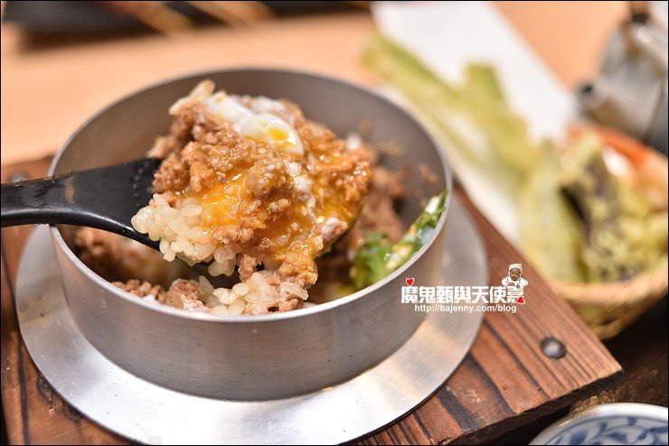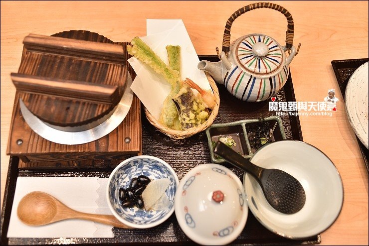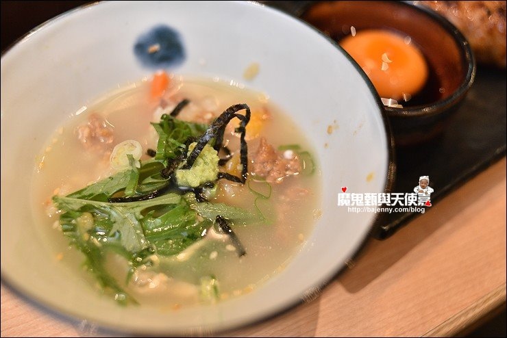 這套是鳥丈雞肉溫泉蛋釡飯套餐,釡飯現點現做需要等約20分鐘,熱騰騰的釡飯上桌看起來很美味,釡飯拌一拌可以直接品嘗,也可以加上海苔及哇沙米提味,或是加上高湯為茶泡飯,一飯三吃,口味多元有變化。