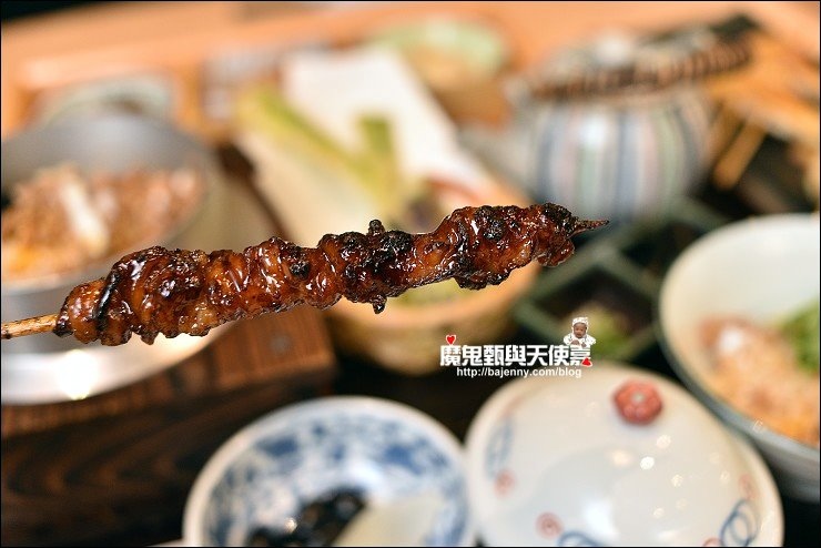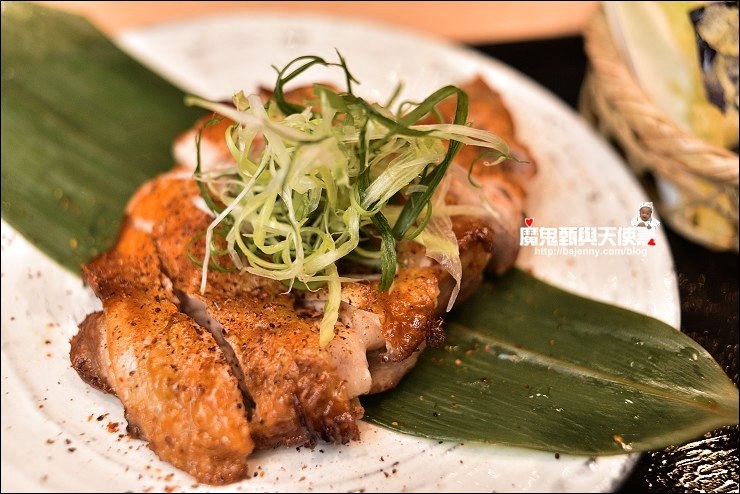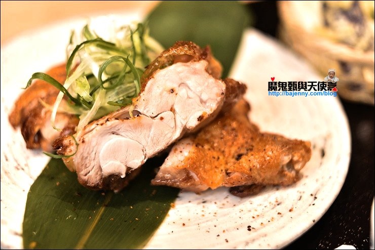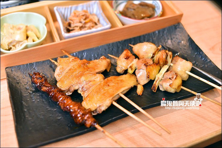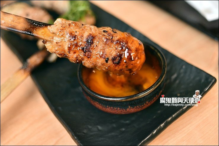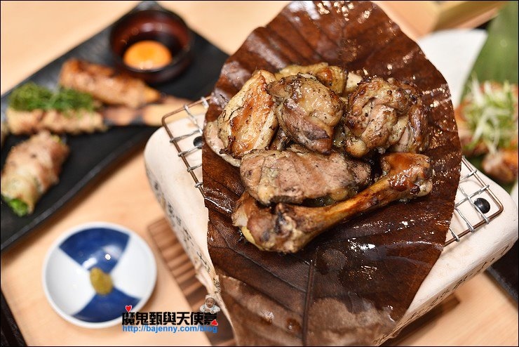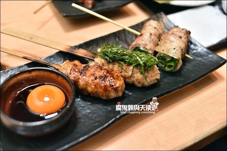 也有使用備長炭的單點燒肉,隨意點了幾串分別是三日皮、雞胸串、三星蔥雞腿肉串、紫蘇梅雞肉丸、月見雞肉丸、三星蔥豬肉捲串,三日皮香又Q,醃制三天,炙燒五次的雞皮,與皮酥帶骨的手羽仙列為必點!