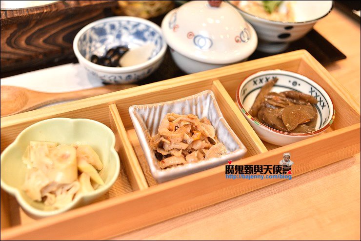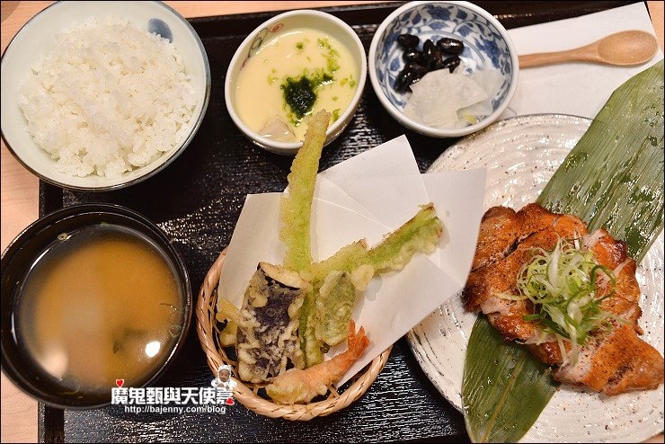 黑七味大蔥雞肉套餐,午膳每套御膳包含餐前沙拉、三道小菜、炸天婦羅、茶碗蒸、味噌湯、漬菜以及主菜,份量很大,我選黑七味大蔥雞肉套餐,鳥丈使用薩索紅標土雞,雞腿肉嫩又甜,皮微酥有香,搭配大蔥絲口感更加分!