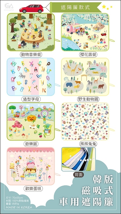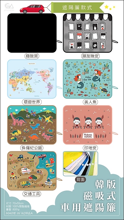 使用方式極為簡單,不是傳統那種需要沾水黏在車上的吸盤式遮陽簾,而且直接利用車體的鐵來吸附固定,所以裝跟拆卸超快速,也可以請小朋友自己來!!任意往前移或往後推都easy,但記得在高速行駛中(尤其是高速公路上)千萬不能開窗,鐵定飛走的啊,有網友表示不小心開窗飛走小孩當下爆哭,因為寶貝太喜歡只好又來補貨XD,對了,圖案花色只有一面喔,背面是素底色。