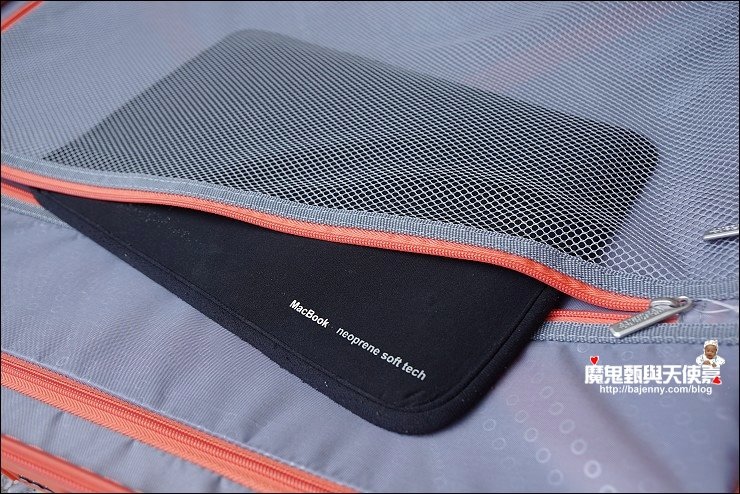 中間拉鏈網子放些面膜、面紙、口罩及溼紙巾小東西,方便拿取,筆電要是不想揹在身上,也可以夾在這邊,或是包在衣服裡也行!