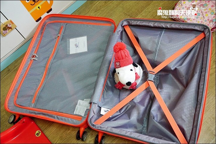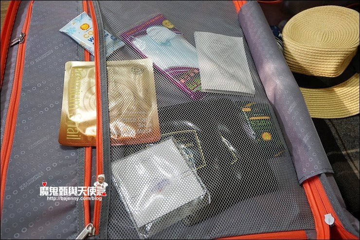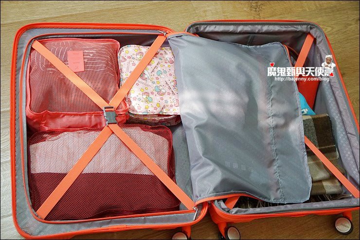 我很怕行李箱二面都是板子,拿取行李時很容易掉東西,我最愛有一面是拉鏈網子的,尤其女生的小東西很多,非常好塞,拿取時也不怕東西掉出來,衣服褲子及化妝包我都習慣放這邊,這咖還了了彈力繩交叉扣固定,不怕運送之後裡頭東西玩大風吹全都走位。