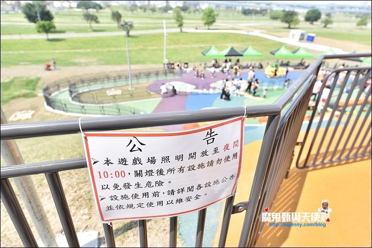 遊戲場照明開放至夜間10:00,傍晚帶小孩來玩避開大太陽,餓了累了可以找可樹蔭下野餐,或是晚點搭捷運去新莊站新莊夜市、台北橋站三和夜市覓食都不錯。搭機場捷運線的話,先殺到林口三井去吃喝玩樂,傍晚再回這裡溜小孩好像也ok。