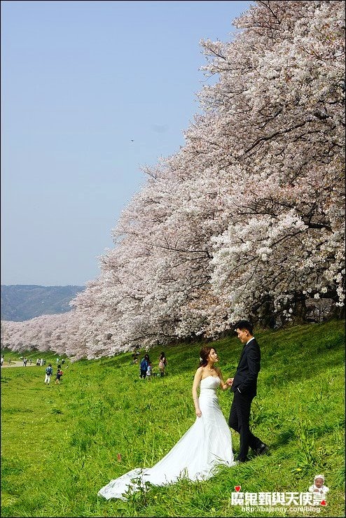 全長1.4公里的背割堤,婚紗外拍聖地,好幾組新人在綠地與櫻花取景,好幸福哦!