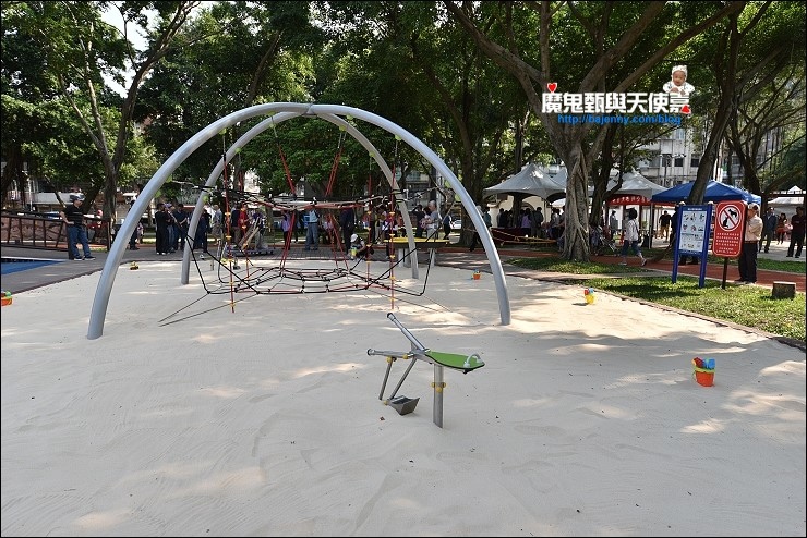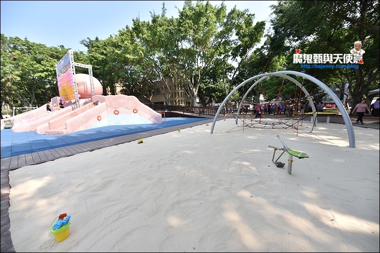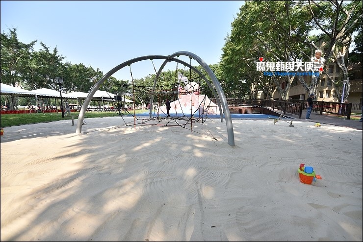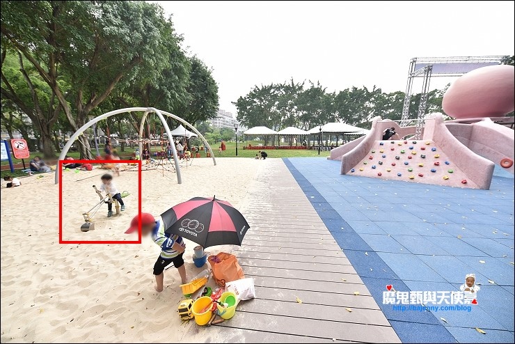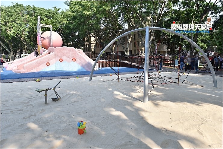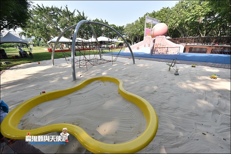 沙坑中間有攀爬網架,二側還有挖土機,剛開幕沙坑的沙子看起來很乾淨,再過幾個月就不知道啦~~
