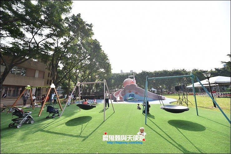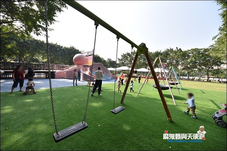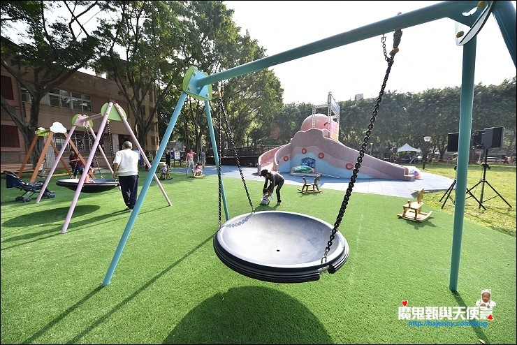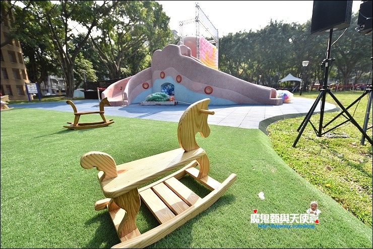 另一頭的人工草皮區有共融盪鞦韆,搖搖馬好像是開幕道具,下午就沒看到了~~