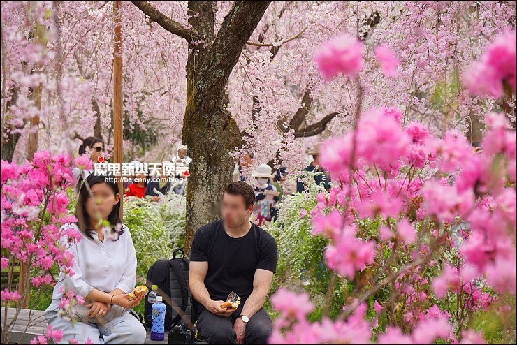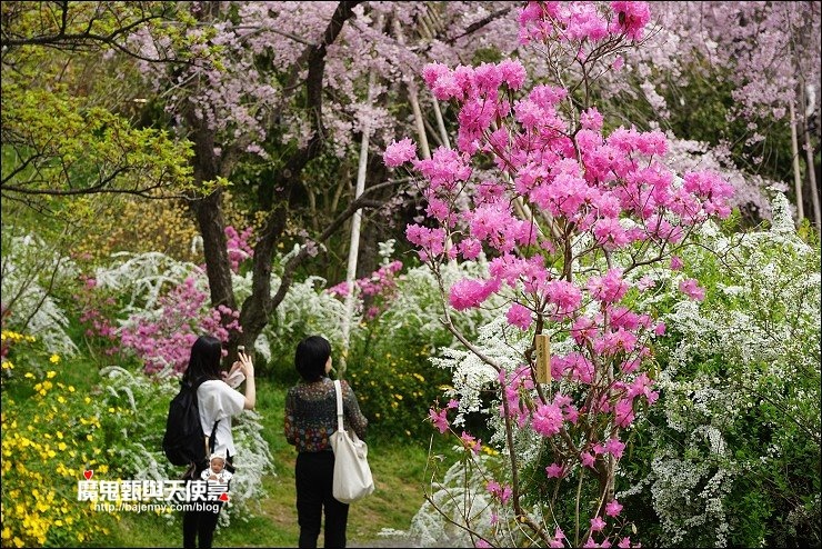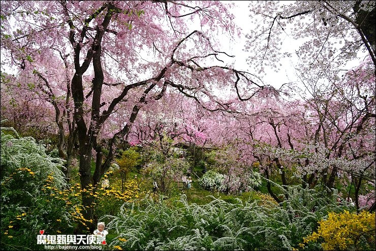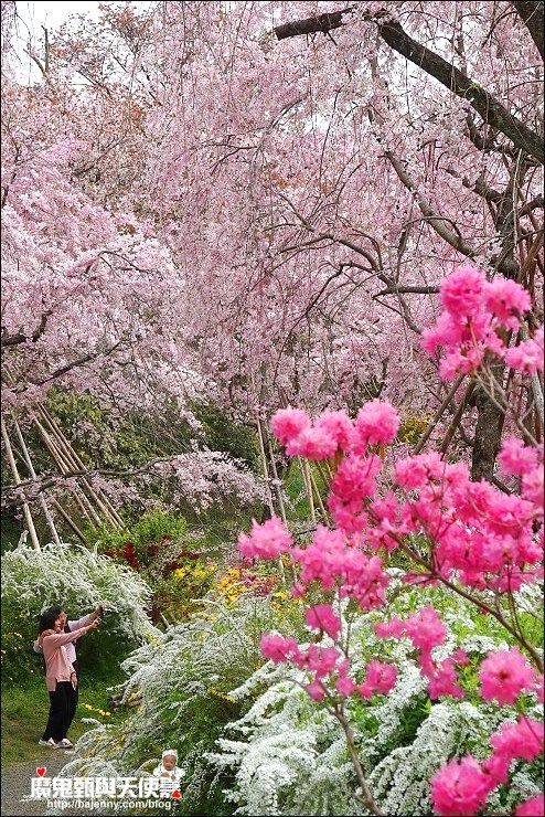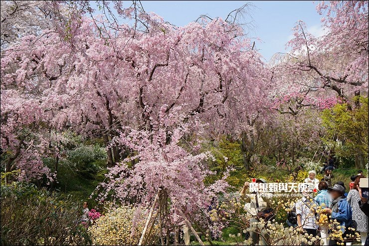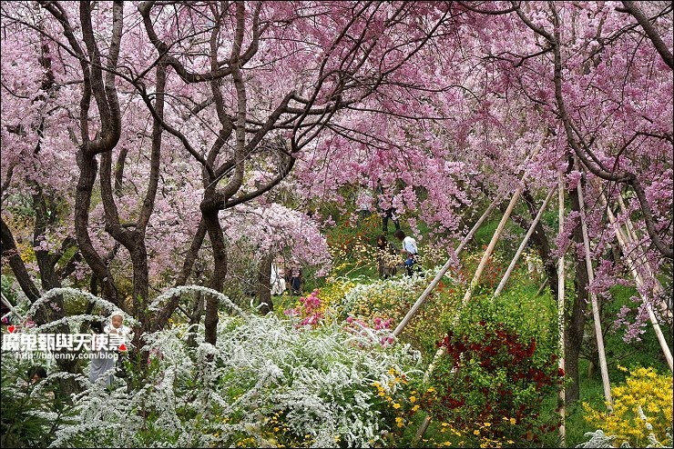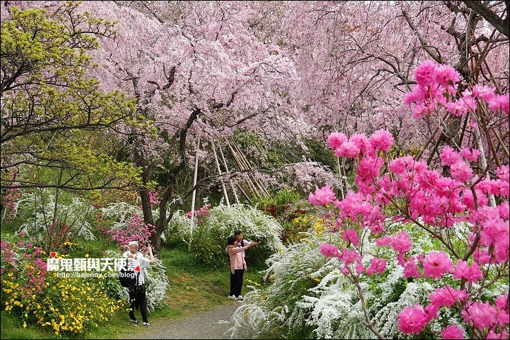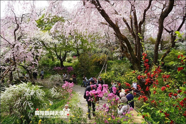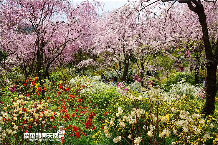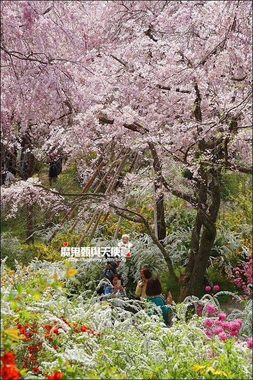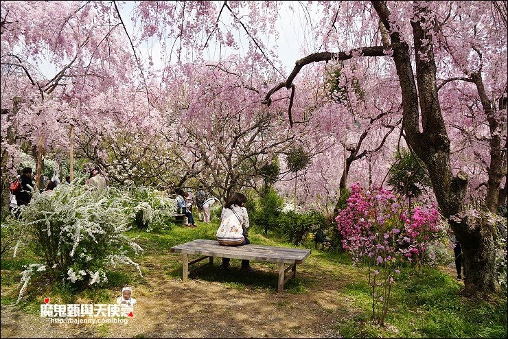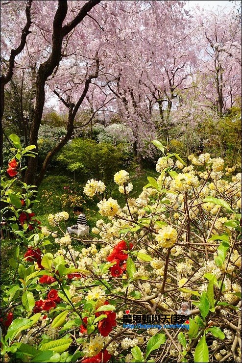 花種眾多,吉野櫻、黄櫻、枝垂櫻、紅枝垂櫻、御室櫻、雪柳、紅梅等等,花園裡顏色豐富、層層疊疊好迷人。