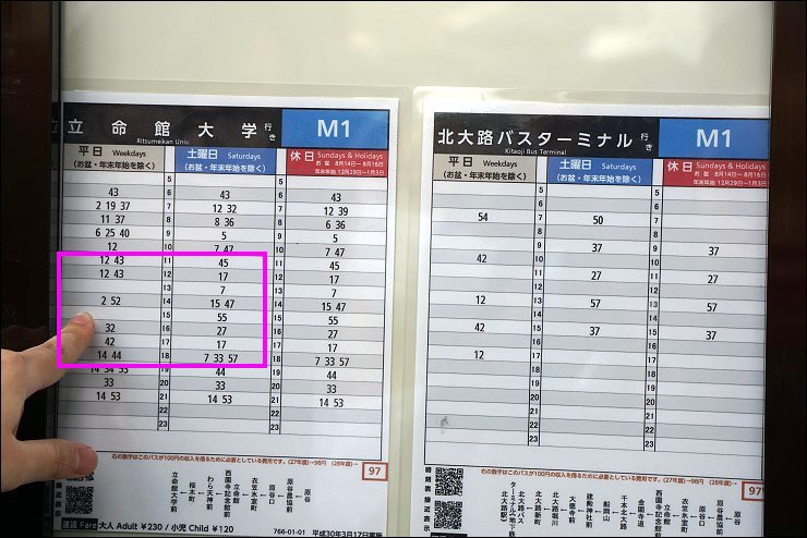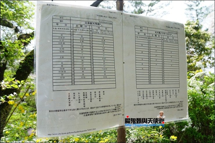 立命館大學前到原谷的 M1 車次時間要查好,11點到下午三點是一個小時才一班車,早上七點有四班車,八到十點一小時二班車,建議早點出門才能賞美景,不浪費時間在等車。M1巴士時刻表:http://www.city.kyoto.jp/kotsu/busdia/hyperdia/218115.htm