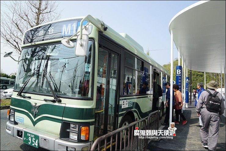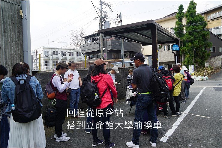 從立命大學前搭到原谷站,車上乘客目的地幾乎都是原谷苑,跟著人走就對了,下車後不要太開心直接衝進原谷苑,記得看一下回程的車次時間,M1班次不多,中午一點到二點還沒車咧,一定要注意賞花時間看要搭幾點的車,不然可能不小心就得等一個小時以上...回程等車人也不少,可以的話提早來等車,不然搭不上車又要等半小時或一小時@@對了,「原谷苑」在金閣寺道前有提供免費接駁巴士,但小巴士可以載的人有限,排隊人很多,要有等好幾班車的心理準備。