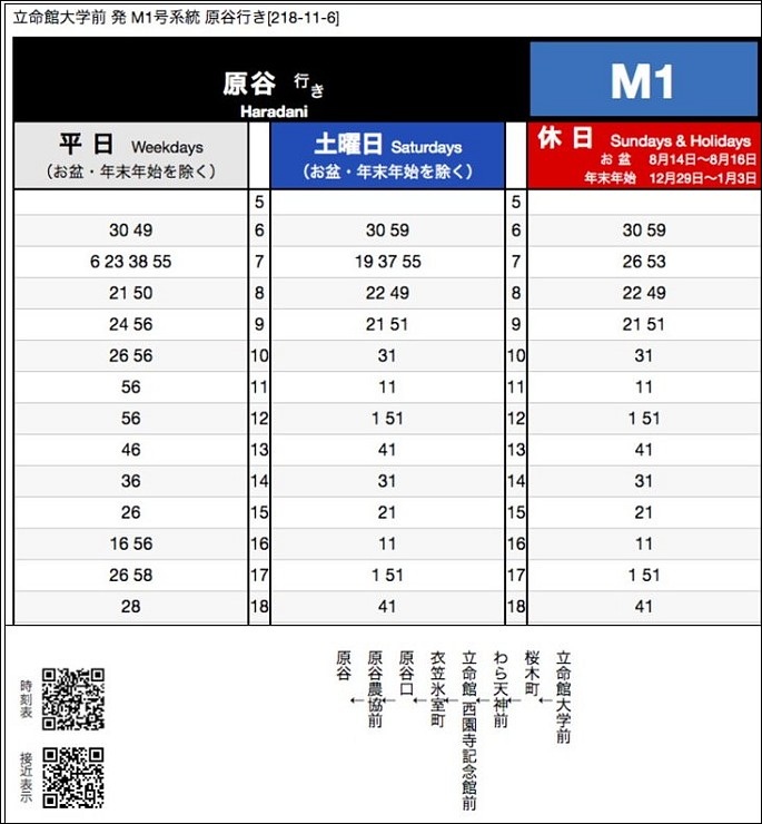 原谷回到立命館大學前的 M1 巴士時刻表:http://www.city.kyoto.jp/kotsu/busdia/hyperdia/766011.htm