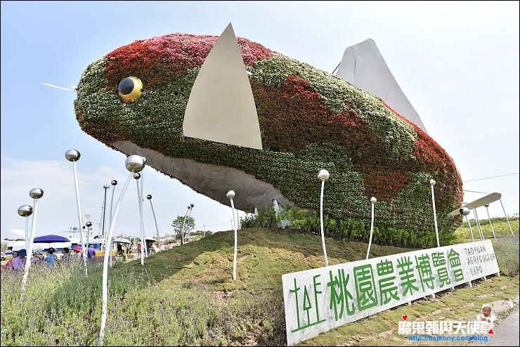 桃園農業博覽會特色產業專案區入口有二張超大錦鯉,根據官網的資料→入口意象是鯉魚躍龍門,以新屋在地特色產業為主題,建構高達8米以上巨大錦鯉綠雕的裝置藝術,創造空間地景中「農田裡跳耀的希望」。向上延伸的水波球造型,象徵桃園農業向上發展的希望無窮。