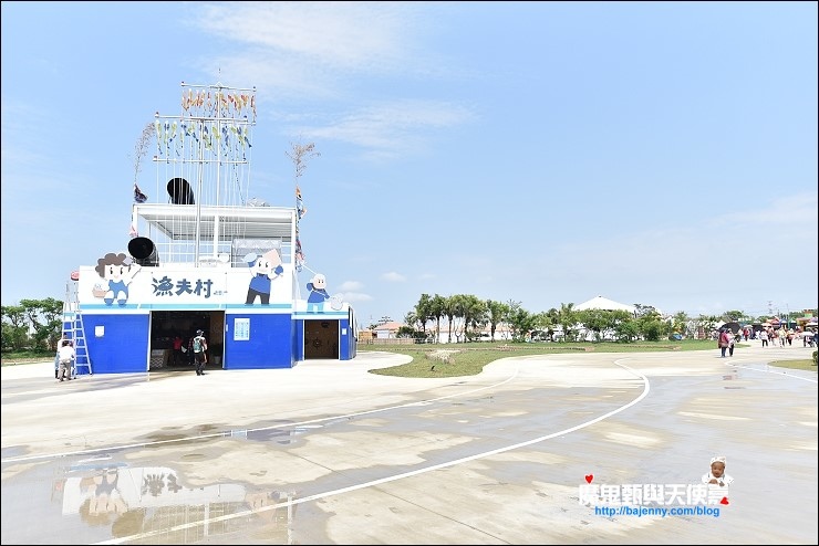 一堆遊客在裡面躲太陽的漁夫村和茶香庄,茶香庄有幾個適合小孩的互動裝置。