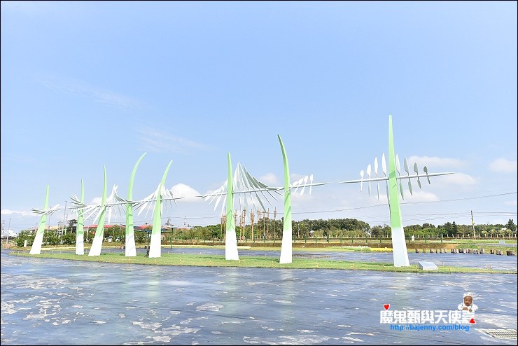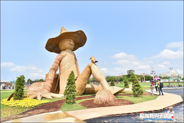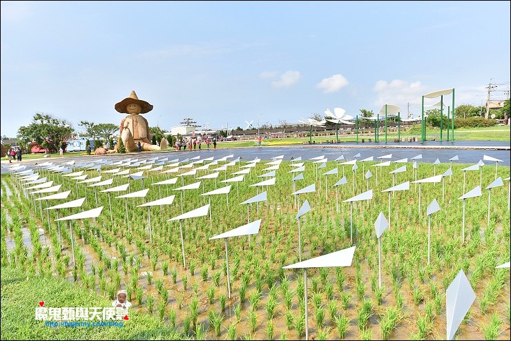 文創藝術專區的「夏禾風」,根據官網的介紹→ 地景藝術專區結合桃園在地風貌,以「風」為主軸貫穿整個場域,打造三座高10公尺之大型風動、農村主題藝術裝置:「大地的旋律」以小草為意象,將觀眾帶入微觀世界,漫步巨型青草之間;「農禾樂」以農夫及稻田中常見的稻草人為發想,呈現豐收後滿足閒適的形象;「與風共舞」以桃園陂塘波光粼粼為主要意象,佐以450支不鏽鋼風箏,隨風舞動、閃耀奪目。另外4件駐村藝術創作,作品包括「風搓-在海與稜線之間雕塑」、「呼吸BREATH(韓)」、「WIND SONG(法)」、「INTOXICATED by NATURE(德)」,打造國際歡騰的藝術氛圍。