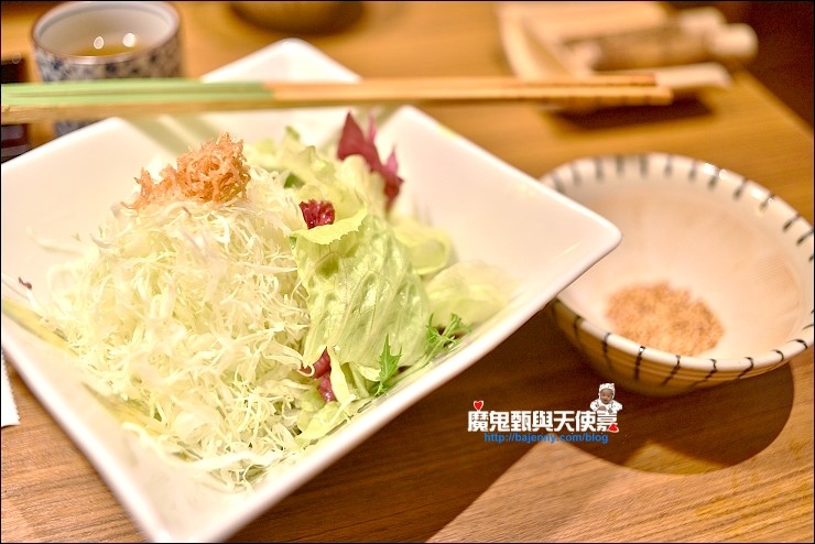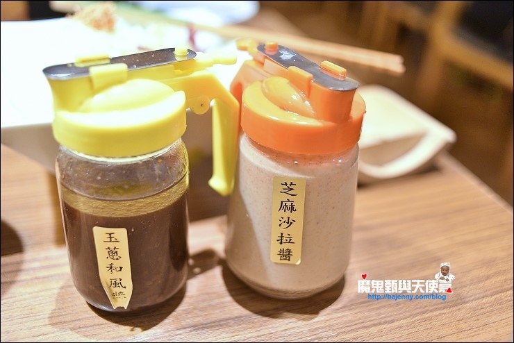 免費吃到飽的美生菜和高麗菜絲,這個是好吃日式炸物丼必備!附芝麻沙拉醬和玉蔥和風醬,小朋友都愛芝麻沙拉醬(用來騙小朋友多吃菜~),但味道重請少量添加,玉蔥和風醬上面浮了一層橄欖油,使用前請先shake shake。