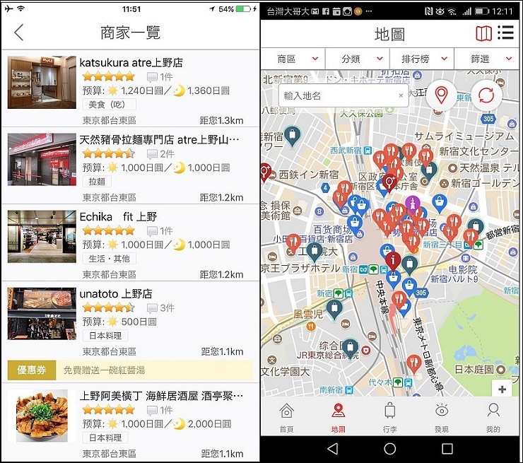 再來就是美食這塊啦,出國除了跑景點,當然美食也是很重要的一塊,點開暢遊日本app,會有所在地週邊的美食地圖,可以用表列示或是地模式來看,我在上野附近逛到二手戰利品外加二腿酸痛,也該找地方吃個飯啦,來到日本一定會來一碗一蘭拉麵!