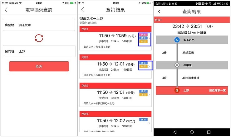 電車換乘查詢在日本走跳一天要用好幾次,從出門前用到回飯店都得查!輪入出發地跟目的地,立馬給你各種路線轉乘,依快速、便捷、省錢排序,我習慣選轉乘最少次來的乘坐,來回機場可以看是要省錢還是要快速,通常特急快車要對號入座的又快又舒服,但車資有可能貴上二倍。大家可以視個人偏好及需求來選擇。