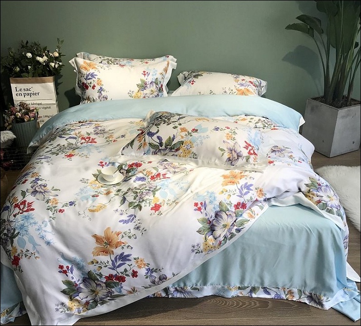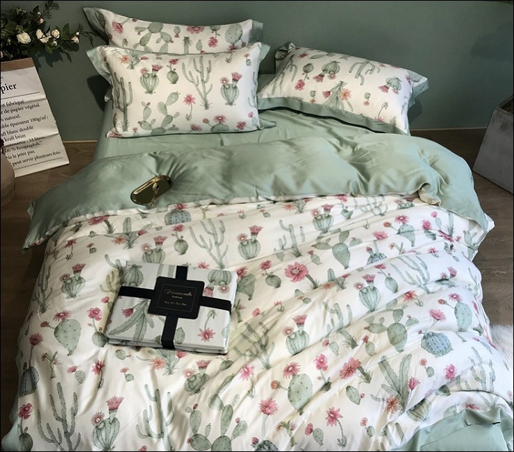 枕套跟被套都是開扣方式,雙面花色都一樣,床單配的是青色,這組就是葉片包圍桔梗花的概念。
