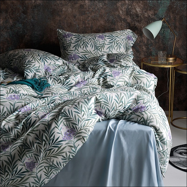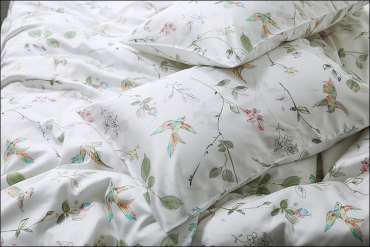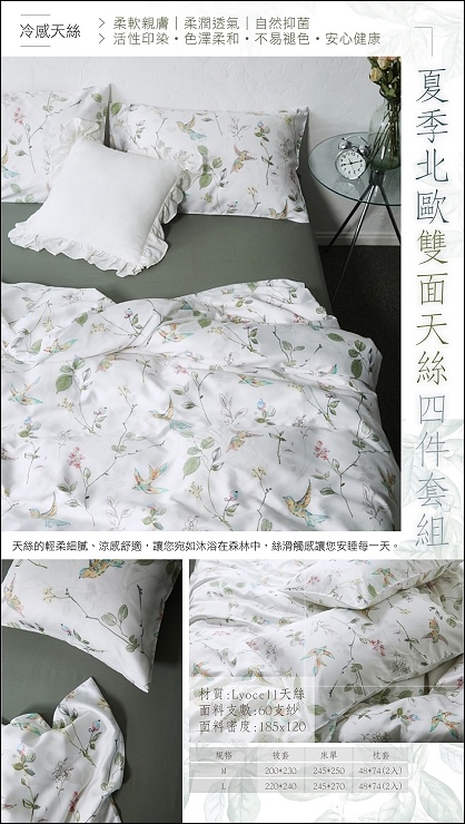 這組天絲花色是雙面的,下面的床單襯的是沉穩墨綠色,小鳥在上面輕舞慢飛,感覺好像置身在森林裡~~