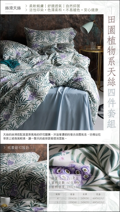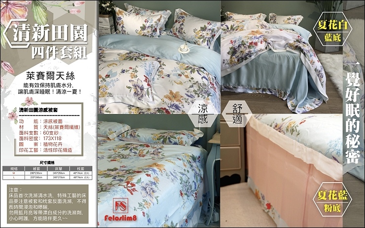 這次開團的六組床組就有四組是天絲材質,主要是天絲觸感細緻滑順並帶有涼感,廠商提供的天絲相關知識如上,還有這次開團的床組規格如上,以棉被大小為主!!因為床單係無鬆緊帶的床罩,非尺寸一定要算凖凖的床包,標準雙人棉被選M SIZE,如果棉被跟床墊大小是吻合的,就依床的大小去選!!如為queen或king size則選L SIZE。