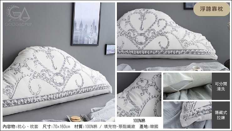 上次開過的浮誇床靠這次加開(而且這次幾乎是破盤價)!寄來的時候枕心枕套是分開的,枕心有抽真空(拆完才想到忘了拍XD),枕套另外袋裝,為隱形式拉鏈,整個尺寸70×160CM,幾乎是兩顆枕頭的大小,枕套可機洗,枕心那麼大應該只能曬太陽消毒。