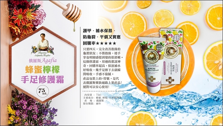 老實說我是個很懶的女人,很少保養也懶得保養,還好我沒有手腳乾裂的問題,所以很少使用護手乳,這款來自俄羅斯的Agafia(阿卡菲老奶奶)手足修護霜聽說熱賣兩萬條!!!我相當訝異,尤其現在並不是乾燥的冬季欸,好神奇呀~~
