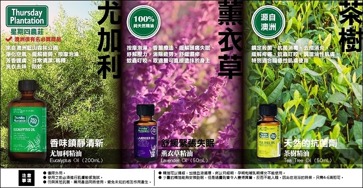 市面上的精油價差很大,我個人覺得澳洲的星期四農莊精油算是不錯的入門款,這次三種精油(尤加利/茶樹/薰衣草)終於一次到位啦,上次茶樹跟薰衣草大缺貨,聽說這家的精油外面代購很多,合作廠商是正式報關進口,不但不用擔心買到假貨,價格還很漂亮!