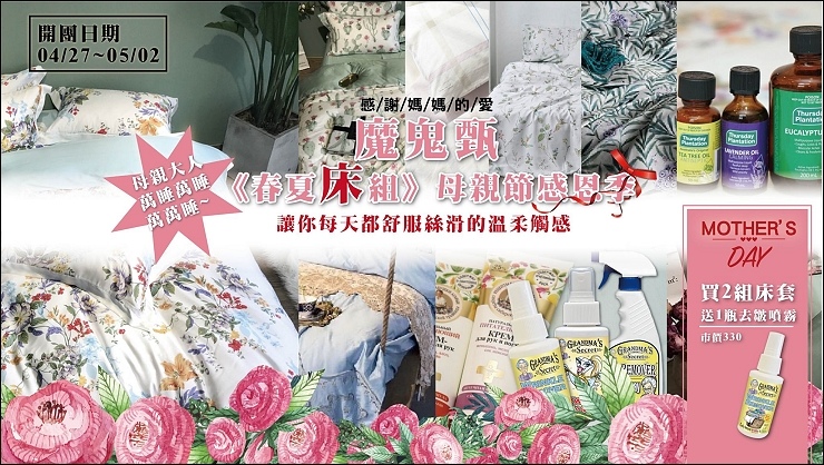 我一直很想再開床組團,畢竟生活用品中床組是一天接觸時間最長的物件,躺在上面觸感細緻滑順就會睡得更好更安穩,花色更是刺激視覺感官第一要件!雖然之前也有不少廠商找我開床組,確實低價床組可以衝高業績,但花色一般我實在過不去XD,要花色好看、又兼具質感、且價位可接受,這三個條件同時存在立馬使得搜尋工作困難許多!所以一直從冬天走到春天(差點等到花兒又謝了),終於,尋尋覓覓許久的合意床組出現!!恰逢春夏時節故以涼感天絲床組為主,皆為四件套組(包括兩個枕頭套、床單及棉被套),如果抓不到媽媽的喜好,我們統計了社團回饋的人氣排名給大家作送禮參考,除了賞心悅目的春夏床組,這次也有澳洲星期四農莊的三款精油(茶樹及薰衣草終於到貨),及聽說熱賣兩萬條的神奇俄羅斯手足修護霜,另外加碼女生很需要的去漬噴霧、免燙去皺噴霧及珠寶清潔液,一直有團友許願開團的鑽石鍋(買1送1),團友後悔買不夠的小熊餅乾可可脆片(送給家有吃貨阿母);這裡要再三提醒大家,所有床組採預購,本來預購品交貨日至少要抓14~21個工作天,但為了偉大的母親廠商願意努力拼拼看,第一天下單的人 #有機會在母親節前夕收到,凡事總有萬一,尤其後段的物流業也不是廠商能夠控管,可以接受的人再下單!!