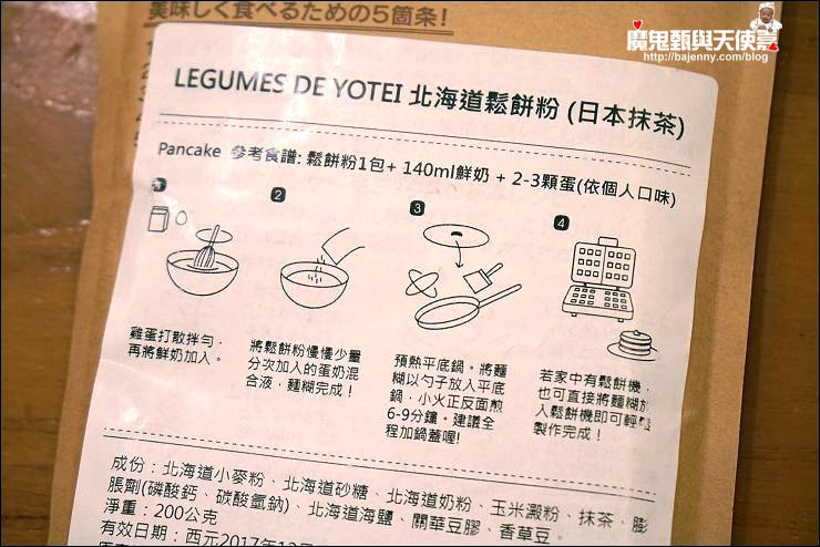 漫漫長假小人在家,到底要跟她們玩什麼,當然就是做鬆餅消磨時間啊~~北海道LEGUMES DE YOTEI小麥鬆餅粉共五種口味,原味香草/巧克力/宇治抹茶/沖繩黑糖 /加拿大楓糖,每包200g,不含鋁膨脹劑、脂肪酸、防腐劑、化學香精,且小麥、海鹽、糖都是產自北海道,獲得2016年樂天金賞第一名的殊榮,在日本當地好評鬆餅粉之一,背面都有貼上詳細清楚的參考食譜,都可以請小人們幫忙。