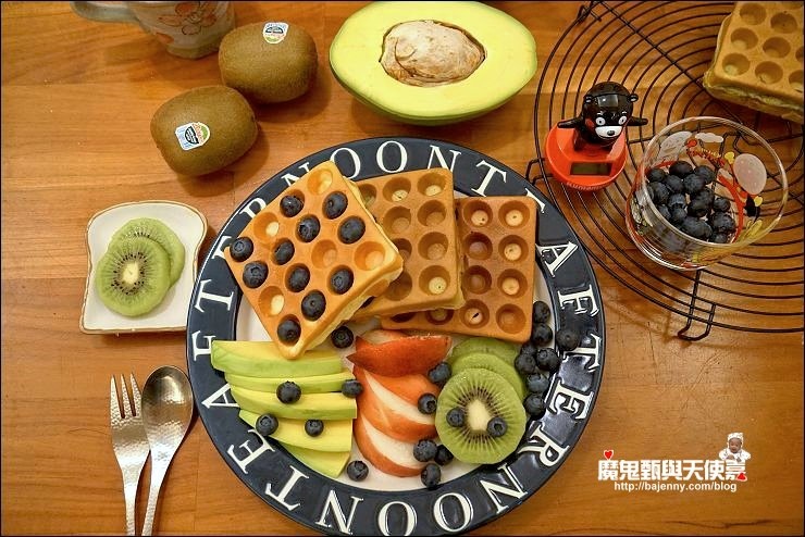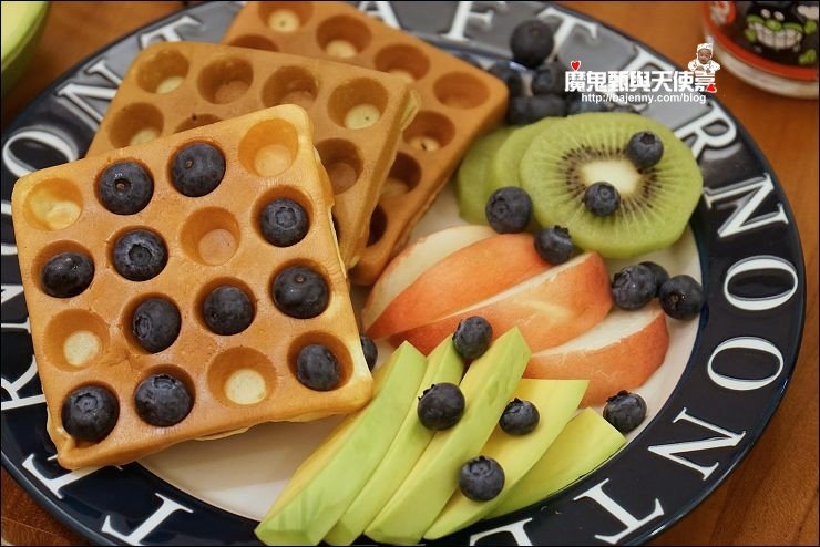 最簡單的格子鬆餅上桌!這時候一定要叫她們多吃水果的啊~~如果有不愛的蔬果(像是酪梨),加球冰淇淋多少可以引誘他們,上面淋點巴薩米克醋更是絕妙!